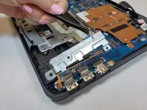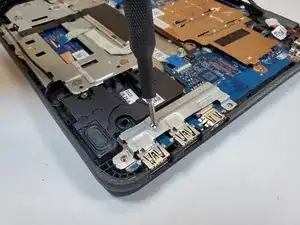 Используйте крестовую отвёртку Phillips #0, чтобы отвинтить два винта 3 мм на металлической скобе, фиксирующей плату.