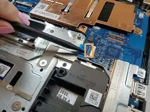 Снимите кабель материнской платы, подняв чёрную планку и аккуратно вынув синюю гибкую шлейф‑ленту.