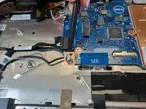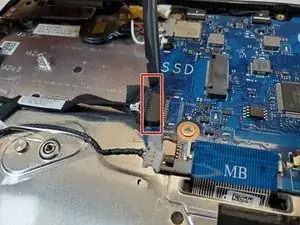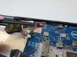 Используйте лопатку, чтобы отключить кабель аккумулятора от материнской платы, расположенный в верхней части батареи.