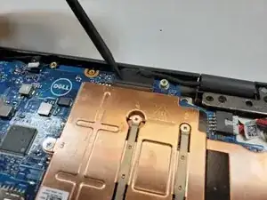 Используйте крестовую отвёртку Phillips #0, чтобы отвинтить винт 3 мм и приподнять металлическую скобу, фиксирующую модуль WLAN на системной плате.