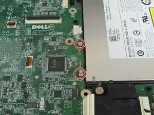 Отверните два серебристых винта, прикрепляющих привод к материнской плате.