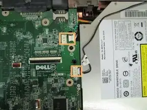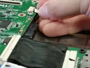 Затем отверните чёрный винт, крепящий привод к материнской плате близко к внешнему краю ноутбука.
