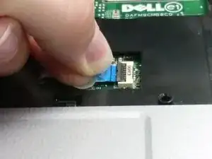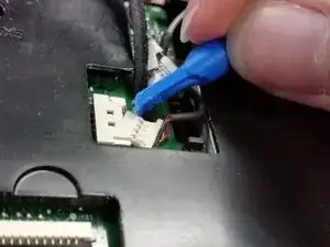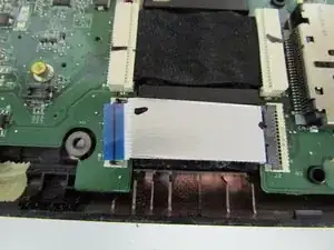 Отключите ленточный кабель от ZIF‑коннектора, подняв маленькую чёрную защёлку лопаткой или ногтем и извлекая кабель, потянув за синюю вкладку.