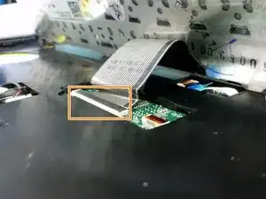 Осторожно отстегните и извлеките ленточный кабель с материнской платы, подняв чёрную защёлку (с помощью лопатки или пальца) и вытащив кабель.
