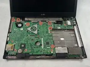 Удалите семь винтов Phillips #0 длиной 5 мм, которые крепят материнскую плату к корпусу.