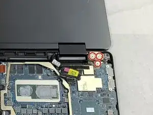 Используйте отвертку Phillips #0, чтобы удалить три винта 6.3 мм, фиксирующих шарнир на стороне над материнской платой.