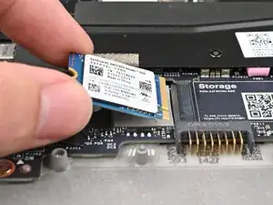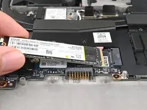 Держа SSD плотно к основной плате, толкните его в разъём до тех пор, пока золотые контакты полностью не закроются.