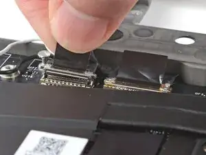 Совместите пресс-коннектор кабеля средней пластины с его разъёмом и нажмите вниз, чтобы подключить его.