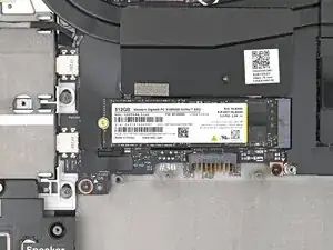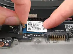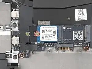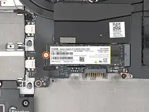 Держа SSD плотно к основной плате, используйте отвёртку Framework, чтобы установить винт T5 Torx длиной 2 мм, фиксирующий SSD.