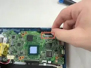 Откиньте фиксатор, удерживающий кабель дисплея, и отсоедините кабель от материнской платы.