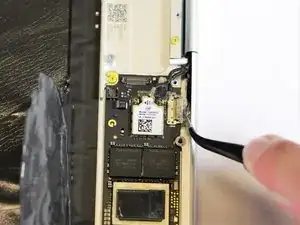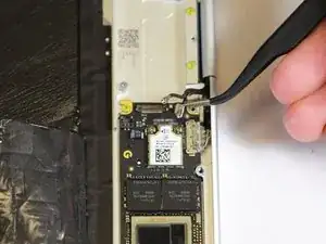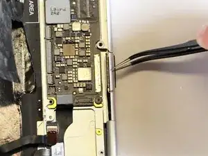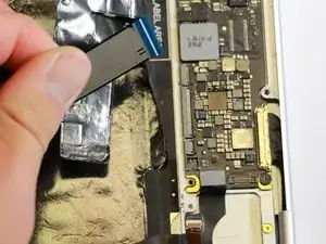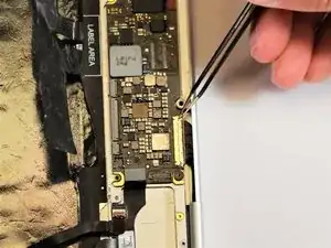 Снимите правый зарядный порт, захватив его пинцетом и подняв из компьютера.