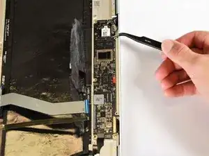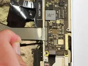 Отсоедините большой плоский кабель от материнской платы, аккуратно потянув за фиксатор пинцетом с тонкими губками.