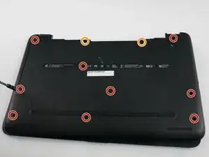 С помощью отвертки Philips P0 открутите девять винтов 2,5 мм x 6,5 мм с нижней части ноутбука.