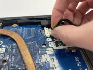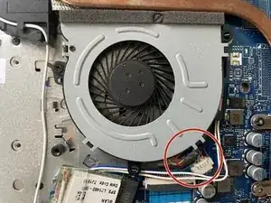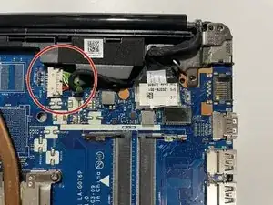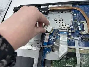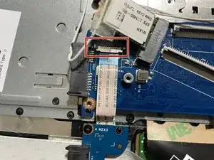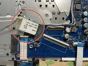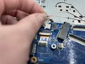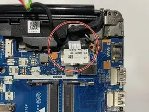 Далее снимите небольшой белый разъём с проводами: два белых, один красный и один синий, как показано на изображении. Он находится под модулем WLAN.
