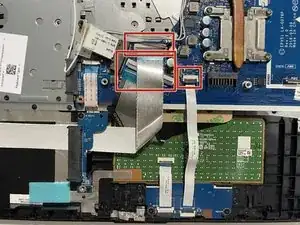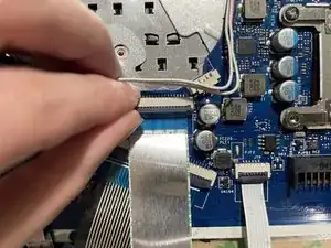 Отсоедините три гибких шлейфа, прикреплённых к материнской плате: поднимите чёрную фиксирующую планку и вытяните шлейфы.