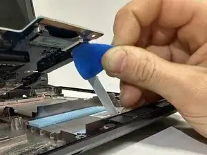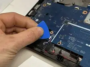 Используя пальцы или медиатор, разблокируйте фиксирующий язычок разъёма ZIF, удерживающий ленточный кабель клавиатуры.