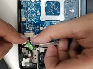 Отключите правый динамик, отодвинув оба конца разъёма от материнской платы поочерёдно с помощью заострённого конца лопатки.
