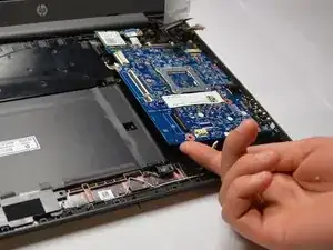 Схватите материнскую плату за её правый нижний угол и выньте её из ноутбука.