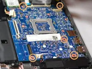 Используйте крестовую отвертку Phillips #0, чтобы выкрутить пять винтов 0.2 мм с материнской платы.