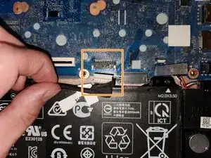Освободите ленту, фиксирующую разъём кабеля батареи на системной плате.