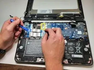 Отключите кабель батареи от системной платы. Потяните кабель прямо из разъёма за белую пластиковую часть вблизи точки соединения.