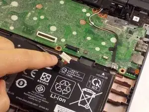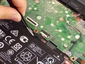 Отклейте чёрную электроизоляционную ленту от проводов, соединяющих аккумулятор с материнской платой, с помощью пинцета.