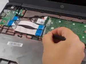 Вставьте инструмент для открывания iFixit в край клавиатуры рядом с тачпадом.