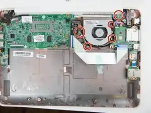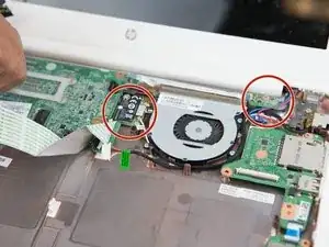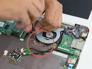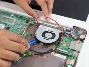 Используйте синий пластиковый инструмент для вскрытия, чтобы отключить разъёмы. Снимите вентилятор с материнской платы.
