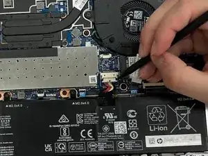 С помощью приспособления для открытия iFixit отключите кабель питания камеры с левой стороны материнской платы.
