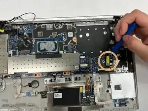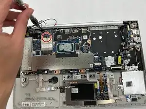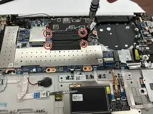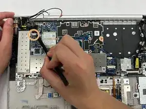 Отверткой PH1 отвинтите винт 4,48 мм, фиксирующий карту WLAN справа на материнской плате.