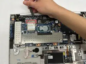 Пластиковой лопаткой отключите аккумулятор от материнской платы.