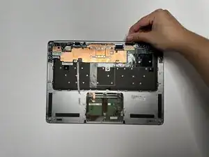 Отделите ленту, удерживающую кабели от батареи и сенсорной панели.
