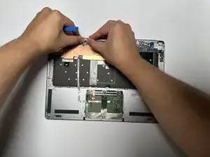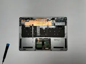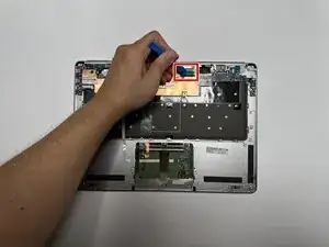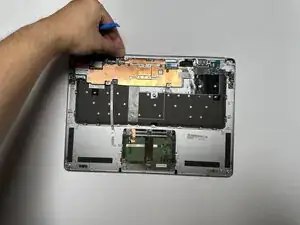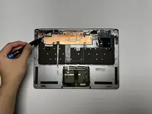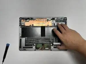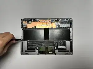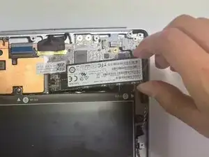 С помощью отвёртки Phillips #0 открутите один винт длиной 3,0 мм, крепящий твердотельный накопитель.