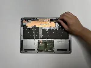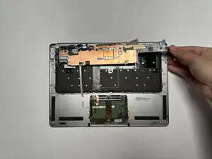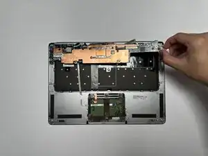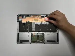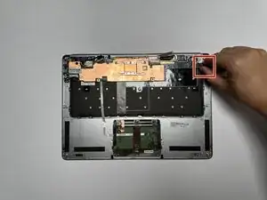 Найдите кабель динамика, подключённый к материнской плате в правом верхнем углу, и аккуратно потяните вниз, чтобы отключить.