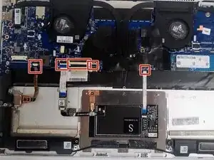 Отсоедините три белых и два коричневых шлейфа, расположенных в нижней части материнской платы.