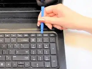 Используя пластиковую лопатку, нажмите на клавиатуру через это отверстие, пока клавиатура не приподнимется.