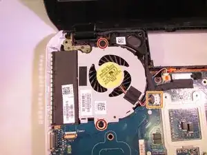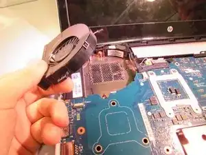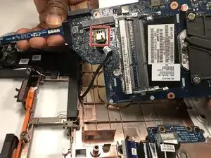 Выньте материнскую плату из ноутбука, следя за тем, чтобы при этом отсоединить кабель на нижней стороне.