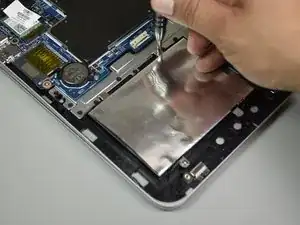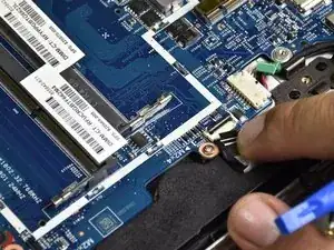 Отключите разъём батареи от материнской платы, аккуратно приподнимая его с обеих сторон пластиковым инструментом для вскрытия.
