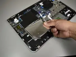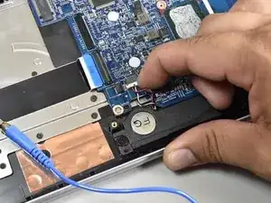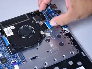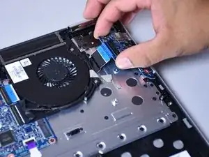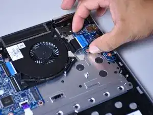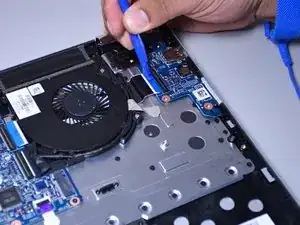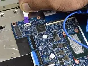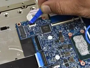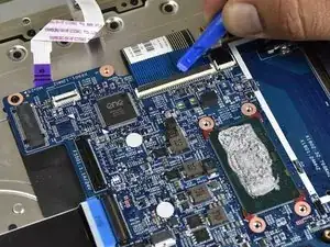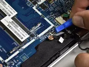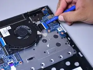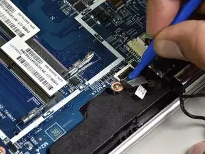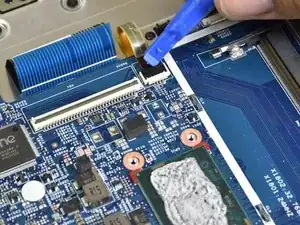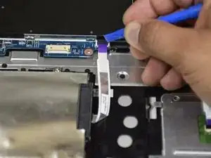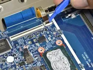 Используйте маленький пластиковый инструмент для раскрытия, чтобы отсоединить разъём, подключённый к синему ленточному кабелю с чёрной полосой.