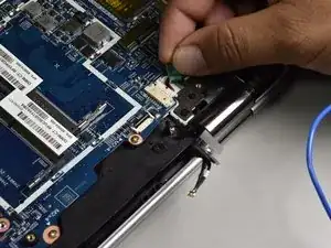 Снимите провод с зелёной пластиковой лентой, находящийся между платой и чёрным шарниром, рукой, потянув его назад.