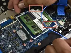 Отсоедините два антенных кабеля от беспроводного модуля, поддев маленьким пластиковым инструментом между кабелями и модулем и приподняв их.