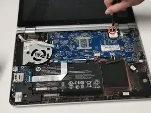 Используя отвёртку Pro tech tool #1, снимите 4,5 мм перекрёстный винт, который крепит материнскую плату к корпусу ноутбука, расположенный над блоком процессора.