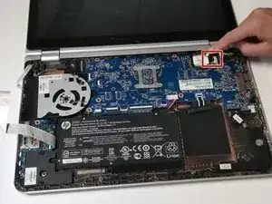 Аккуратно покачайте вентилятор и материнскую плату влево и вправо, чтобы отсоединить разъёмы, расположенные на правой стороне ноутбука. Теперь вы можете безопасно извлечь материнскую плату и вентилятор.