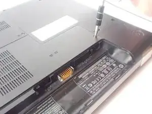 Одновременно тяните фиксатор и вынимайте батарею, удерживая её горизонтально и параллельно корпусу ноутбука, чтобы она легко выскользнула.