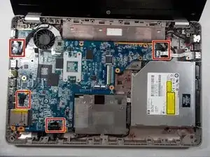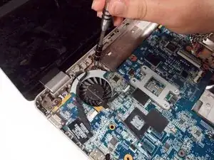 Отвинтите два винта материнской платы и винт вентилятора, фиксирующие их к остальной части корпуса, крестовой отверткой #1.