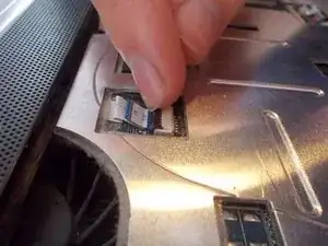Оттяните две металлические защёлки от верхнего модуля оперативной памяти наружу параллельно корпусу ноутбука.