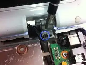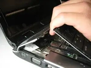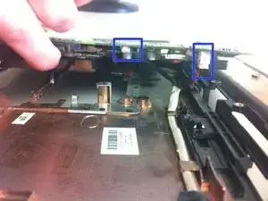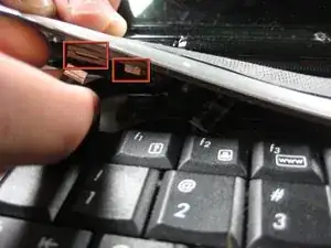 Вам нужно будет снять рамку под шарниром ЖК-дисплея, чтобы окончательно извлечь верхнюю панель для отдыха ладоней.