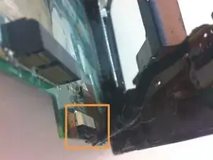 Для продолжения необходимо снять ЖК-панель. Начните с отключения отмеченного кабеля от его гнезда и отсоединения кабелей от их держателей в опорной панели.