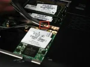 С помощью пинцета отсоедините обе антенные разъемы от гнезд беспроводной карты. Это разъемы с защёлкой; просто потяните их прямо вверх, чтобы снять с контактов на карте.