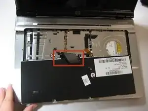 Отключите ленточный кабель клавиатуры (выделен красным) от его разъема на материнской плате.